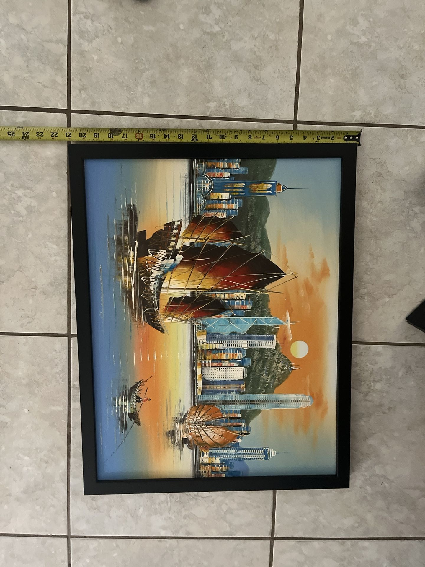 Vibrant framed painting. Has a cityscape with boats and sunset colors. Measures about 24.5 inches wide and 16.5 inches tall. Nice art for your wall.