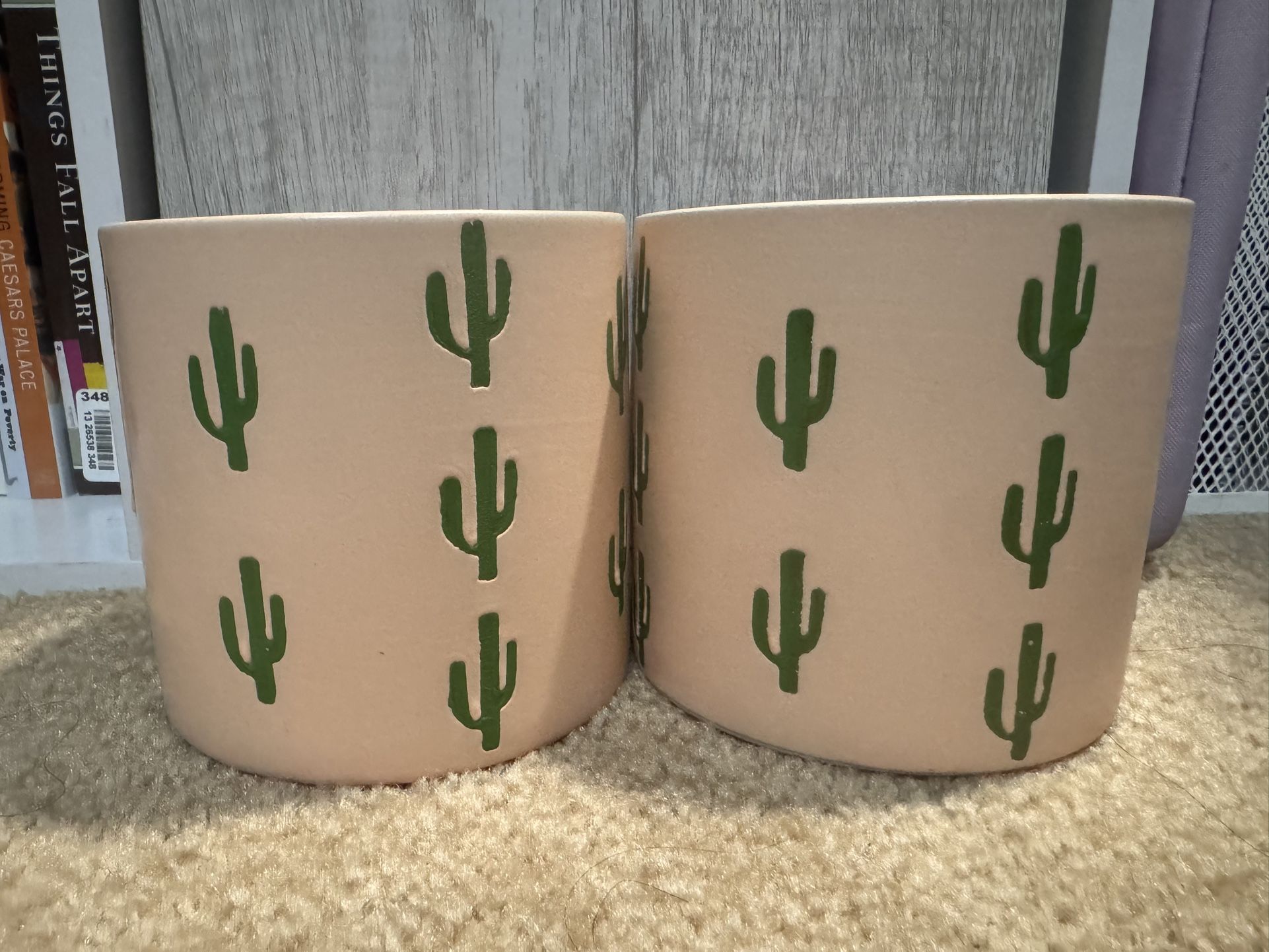 Set of 2 Ceramic Round Flower Pots Beige Green Cactus Design