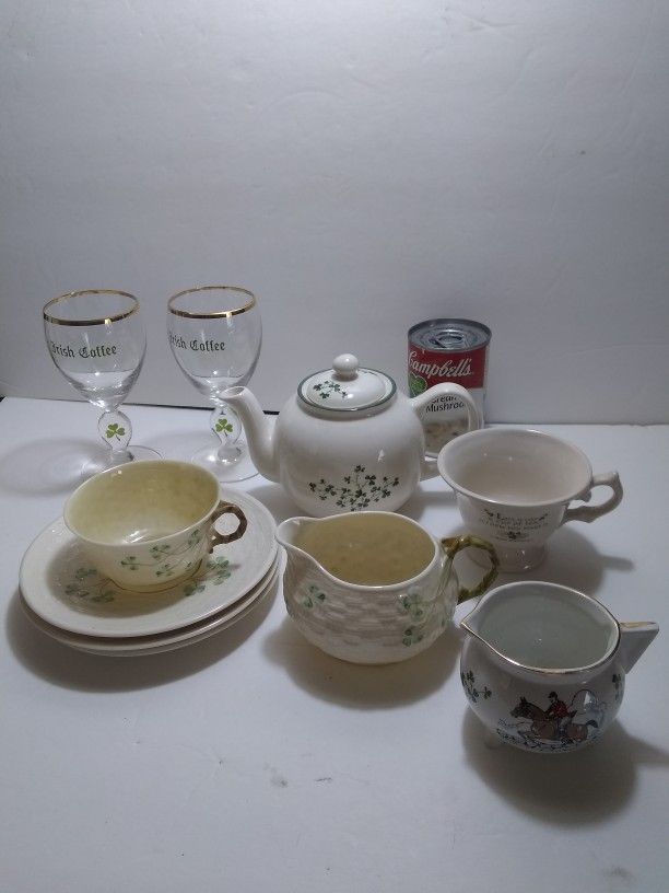 selling as a lot a Variety of Belleek porcelain and Carrigaline Cork Ireland items which include Belleek creamer pitcher teacup three saucers and Carrigaline small teapot and creamer pitcher .... Also 2 shamrock in the glass Irish coffee glasses ... All items are in excellent condition with no chips or cracks