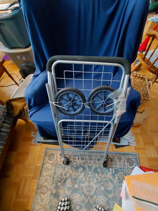 Good for going shopping with, easy way to get groceries and packages from stire to the car.Also used could be used to take laundry to laundromat or to laundry room in apt.building. New, assembly required. Front wheels swivel 360 degrees.