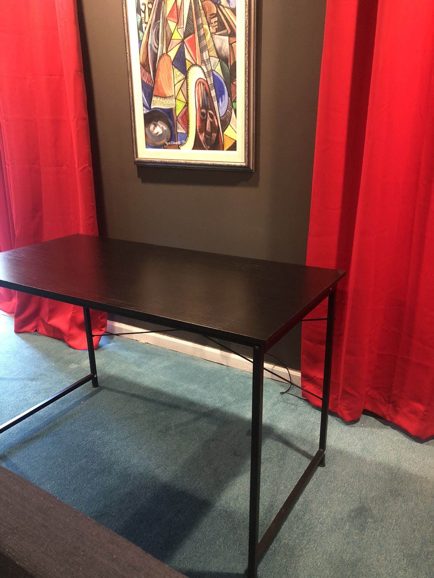 Black wood laminate top. Good condition. Metal frame. Simple assembly required. We have broken it down for storage and transport. May be able to meet at a convenient location Measures 48X24 for the desk top