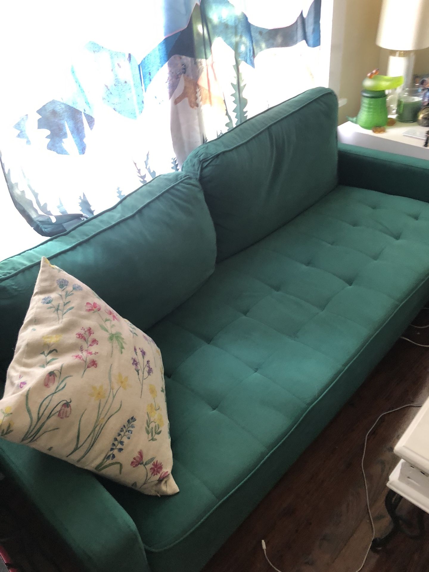 Pickup today or tomorrow only. Green velvet. Couch is 30”Dx68”Wx34.3”H.