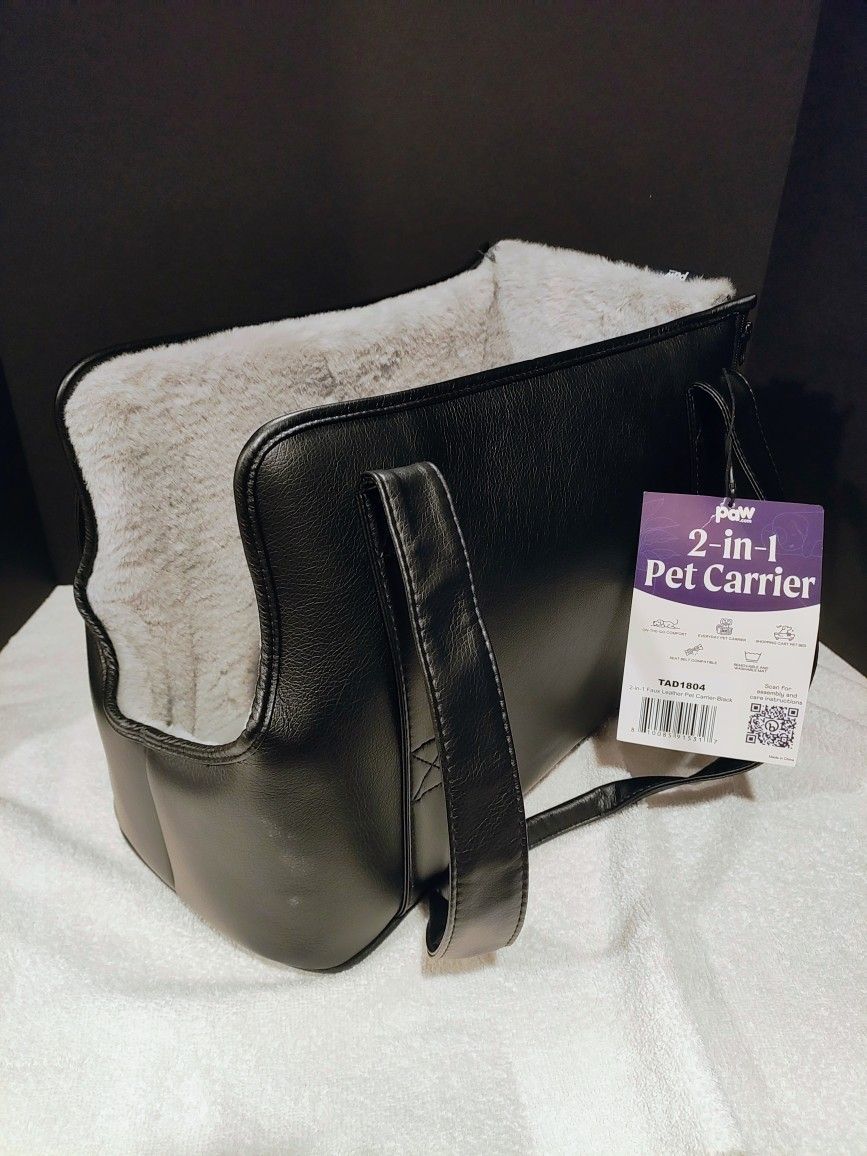 New 2-in-1 Faux Leather Dog Carrier Bag - Black. The versatile carrier is the ultimate solution for carrying your small dogs with style and functionality. The multifunctional carrier bag can accommodate dogs up to 20 lbs. Perfect as a cozy and safe retreat for city trips or as a mobile dog bed on the go in your car or shopping cart. Benefits include: integrated leash with hook fastening on inside to clip to dog harness or collar for safety, cozy faux fur insert that is removable and washable, convenient pocket for storing all of you and your pup's essentials, & openings on sides that allow your dog to see what's ahead and reduce anxiety. Dimensions: 14'' L x 7.5'' W x 12'' H. Thanks for looking please check out my other listings.