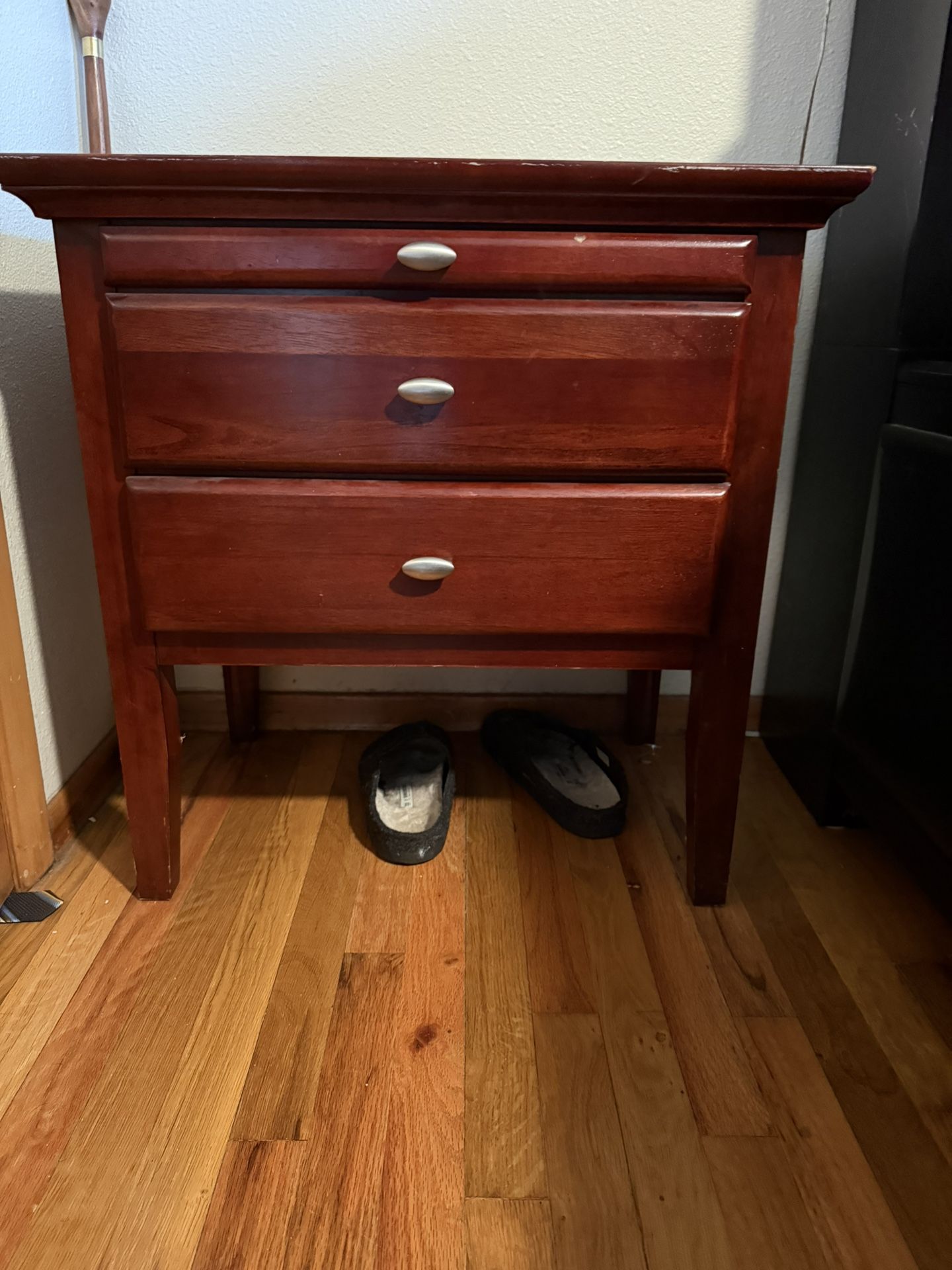 These are two matching solid oak nightstands. Please note I only took a photo of one. Like I said they match and they are in very similar condition. Each features two drawers and a pullout flat top. Structurally they are an excellence shape but the finish is worn off a little bit here and there. Please see the photos