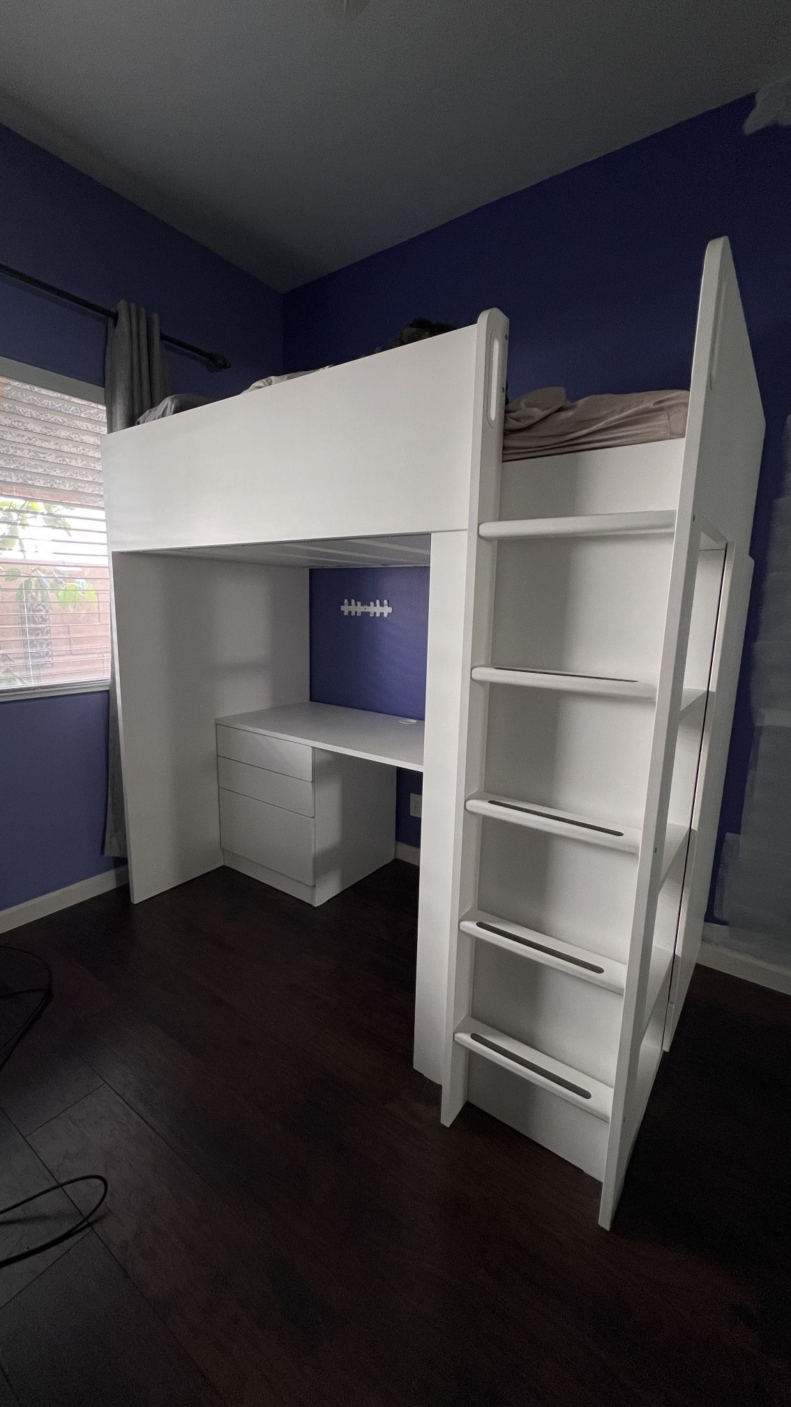 Twin loft bed, with closet and a drawer , desk with 3 drawers , partially disassembled, comes with all parts labeled and the assembly instructions. In very good condition