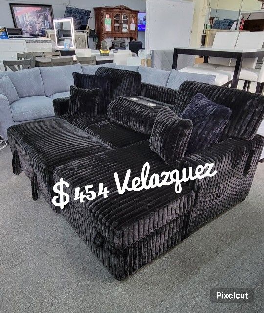 ✅️✅️2 pc Black fur like corduroy fabric sectional sofa with pop up sleep area and storage chaise drop down tray table USB ports. Sectional features a pull out sleep area and storage chaise , with drop down tray table with cup holders on back of center cushion, USB ports on the side arm. Sectional measures 92" x 60" x 37" H✅️✅️$454+ sale tax $498 total,cash only, this promotion is just pick up only Delivery is not available ✅️✅️✅️