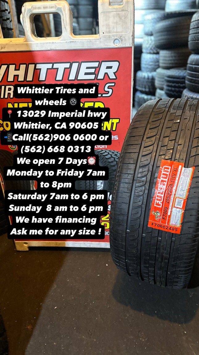 WHITTIER TIRES 13029 IMPERIAL HWY WHITTIER CA 90605 CALL (562)906-0600 TEXT (562)413-6926 - WE HAVE THE BIGGEST USED & NEW TIRE INVENTORY AVAILABLE, ASKS US FOR ANY SIZE YOU NEED. FINANCING OPTIONS AVAILABLE, 90 DAY NO INTEREST! HABLAMOS ESPAñOL. OPEN MONDAY-FRIDAY 7AM-8PM, SATURDAY 7AM-6PM, SUNDAY 8AM-5PM 185/65/14 175/65/15 185/55/15 185/65/15 195/65/15 205/55/16 215/55R16 215/60/16 205/65/16 245/75/16 265/70/16 285/75/16 265/75/16 215/45/17 225/45/17 225/50/17 215/50/17 215/55/17 235/65/17 245/65/17 255/65/17 265/70/17 285/70/17 33x12.50r17 215/45/18 225/40/18 235/40/18 235/45/18 245/45R18 235/60/18 245/60R18 265/60/18 255/70/18 265/70/18 33x12.50r18 225/40/19 235/40/19 245/40/19 245/45/19 245/35/20 245/45/20 245/50/20 255/50/20 265/50/20 275/55/20 275/60/20 33x12.50r20 35x12.50r20 37/13.50R20 265/35/22 285/45/22 305/40/22 305/45R22 33x12.50R22 295/35/34 305/35R24 ESPECIAL DE LLANTA NUEVA Y USADA GOODYEAR MICHELING BRIDGESTONE FIRESTONE CONTINENTAL ARROYO YOKOHAMA PIRELLI KUHMO TOYO ATLANDER LANDGOLDEN LANDSPIDER LLANTAS TIRES WHEELS