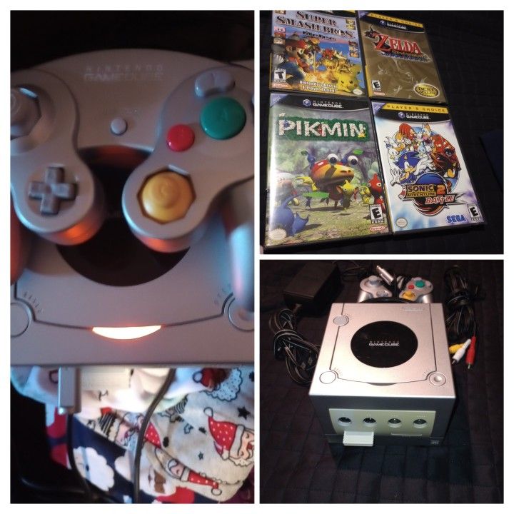 Platinum color GameCube with 1 controller 1 memory card Power supply AV cable Zelda windwaker cib Pikmin cib Smash bros melee cib Sonic adventures 2 cib everything for $375 cash only