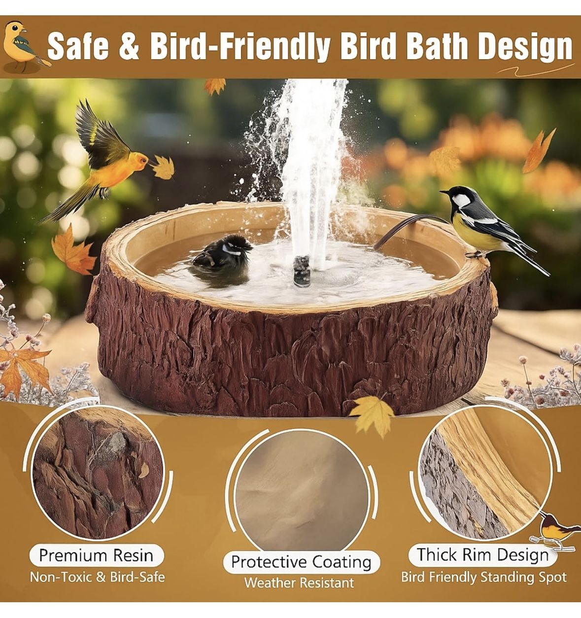 Bird Baths for Outdoors, 13.5" Resin Bird Bath Bowl with Water Pump and 2 Nozzles, Trunk Style Birdbath Fountain Bowl, Outdoor Feeder BirdBowl for Fal