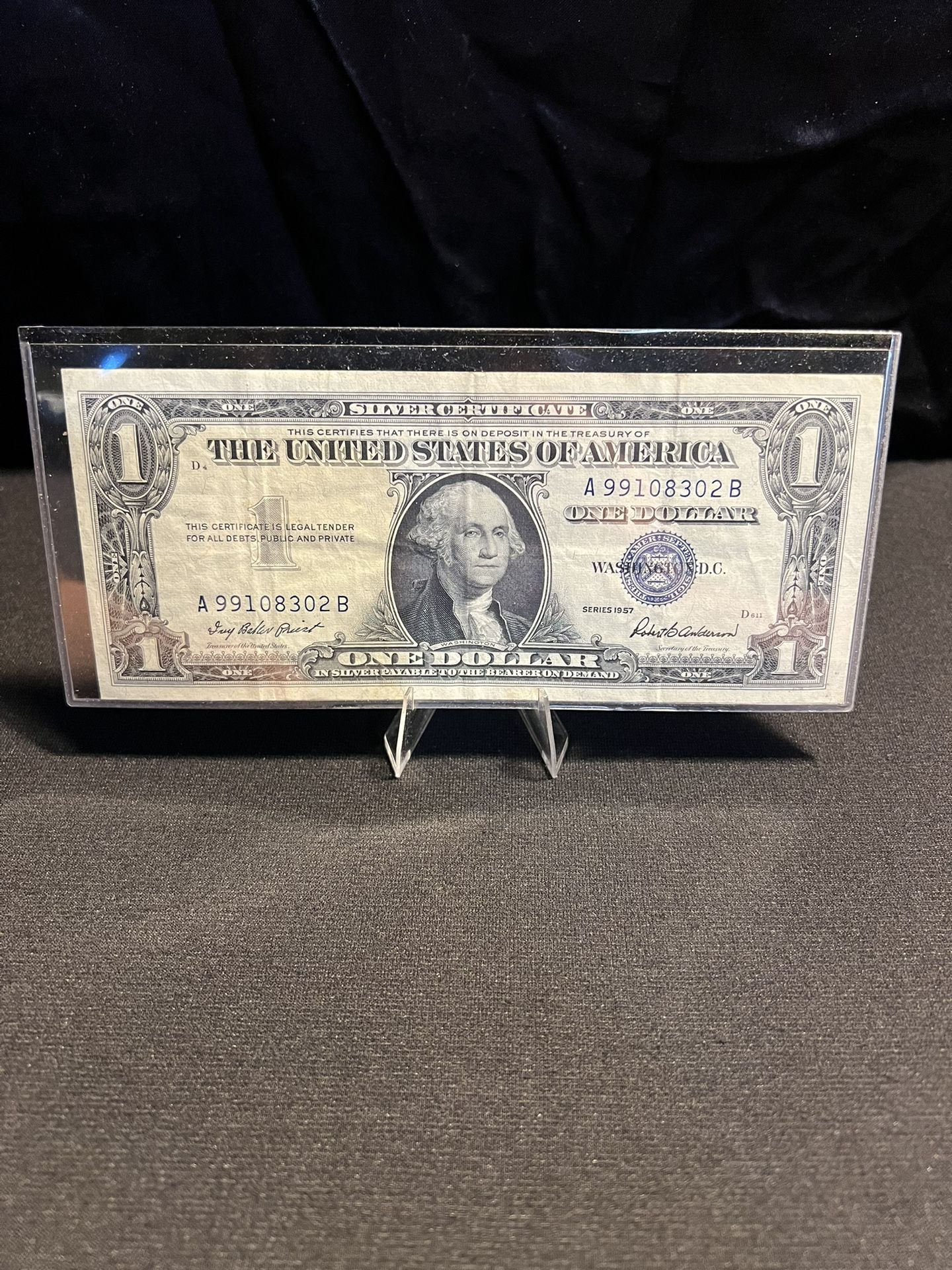 Listed for sale is a 1957 last year of production collectible silver certificate dollar bill in very good condition a historic US bank note featuring George Washington, a blue seal, and text promising redemption for silver, marking the first appearance of” in God we trust” on currency. A very collectible historic silver certificate paper currency. #((contact info removed)2 B)
