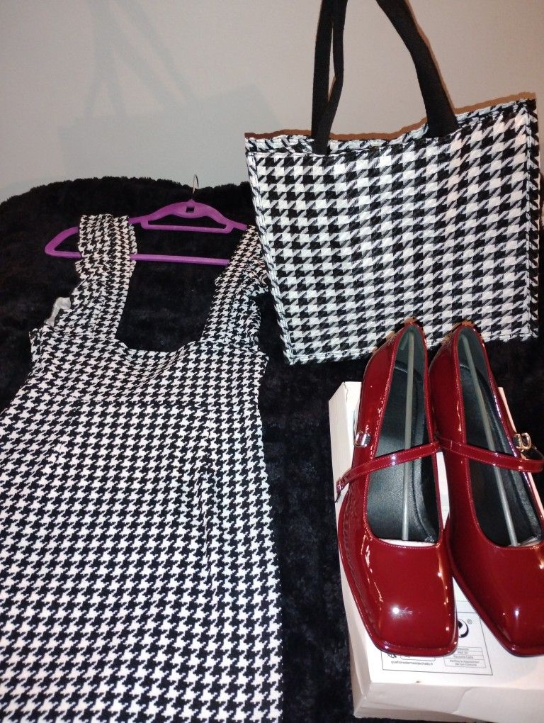 I bought this brand new outfit never worn. It's almost like a jumper but it's a dress. You can wear a burgundy long sleeve with it. or whatever color long sleeve you prefer. Size 10 shoes in UK 42 women. Size small black and white outfit. But it look like it could be a medium.