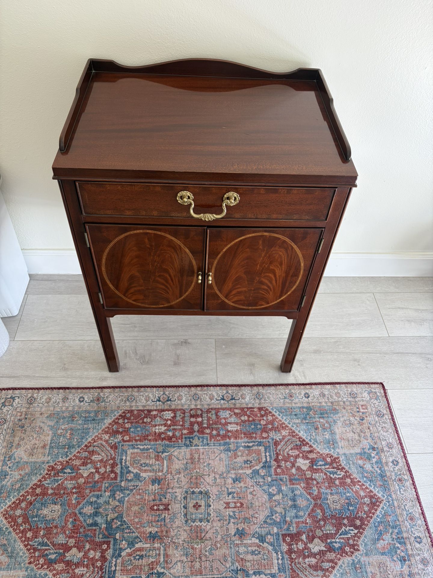 This item is frequently referred to as a nightstand, bedside cabinet or end table. Designed in the Georgian or Chippendale style, the piece features a gallery or top tray, a single drawer, two cabinet doors with oval inlays, and brass hardware. Item is in good condition but does have a few minor scratches and one nick on the top section which is shown in the picture. Council Craftsman is a high-end furniture maker known for quality reproductions of classic styles. Table measures 22” w x 16” d x 29” h. We