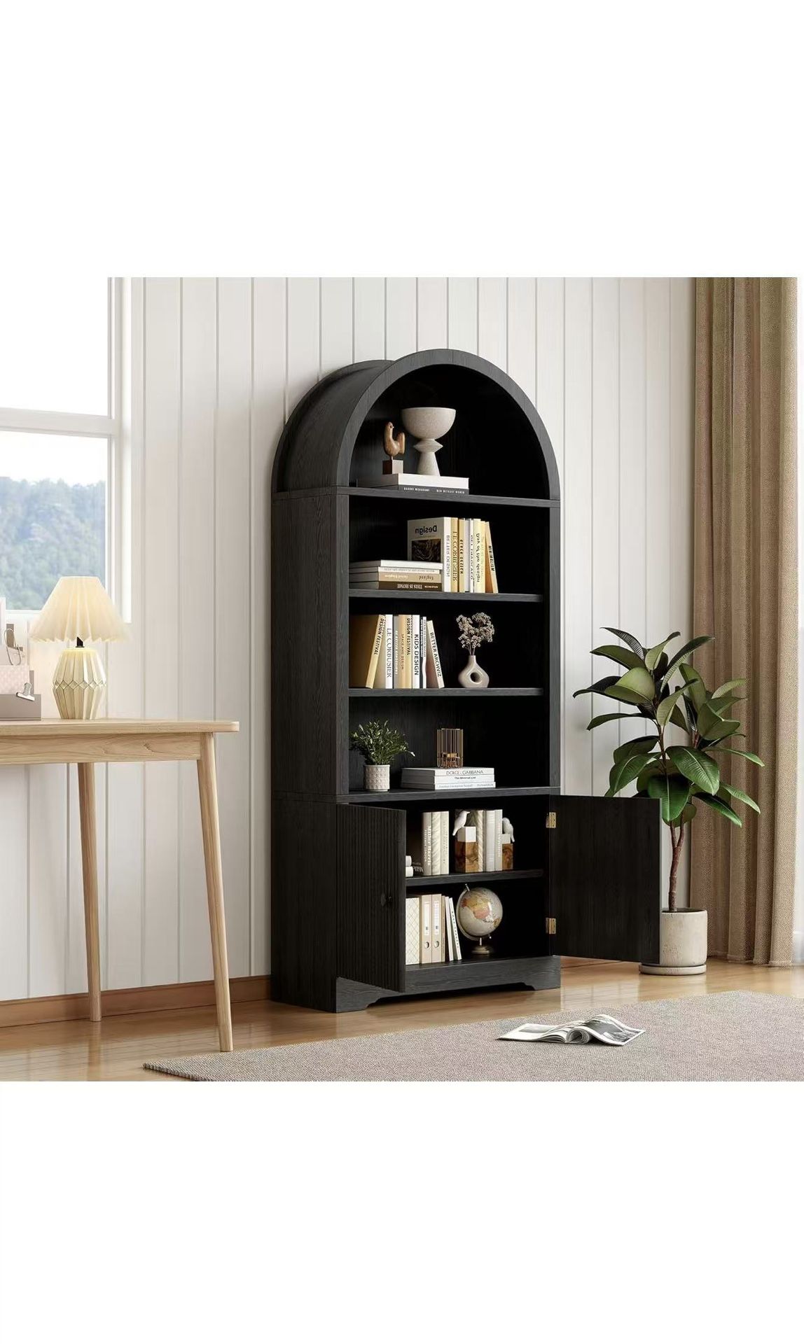 Modern Arched Wooden Bookcase Cabinet with Storage, 6 Tier Freestanding Storage Shelves with Door, Farmhouse Bookcase Kitchen Pantry Cabinet, for Home Office, Kitchen, Bathroom, Black Oak$150