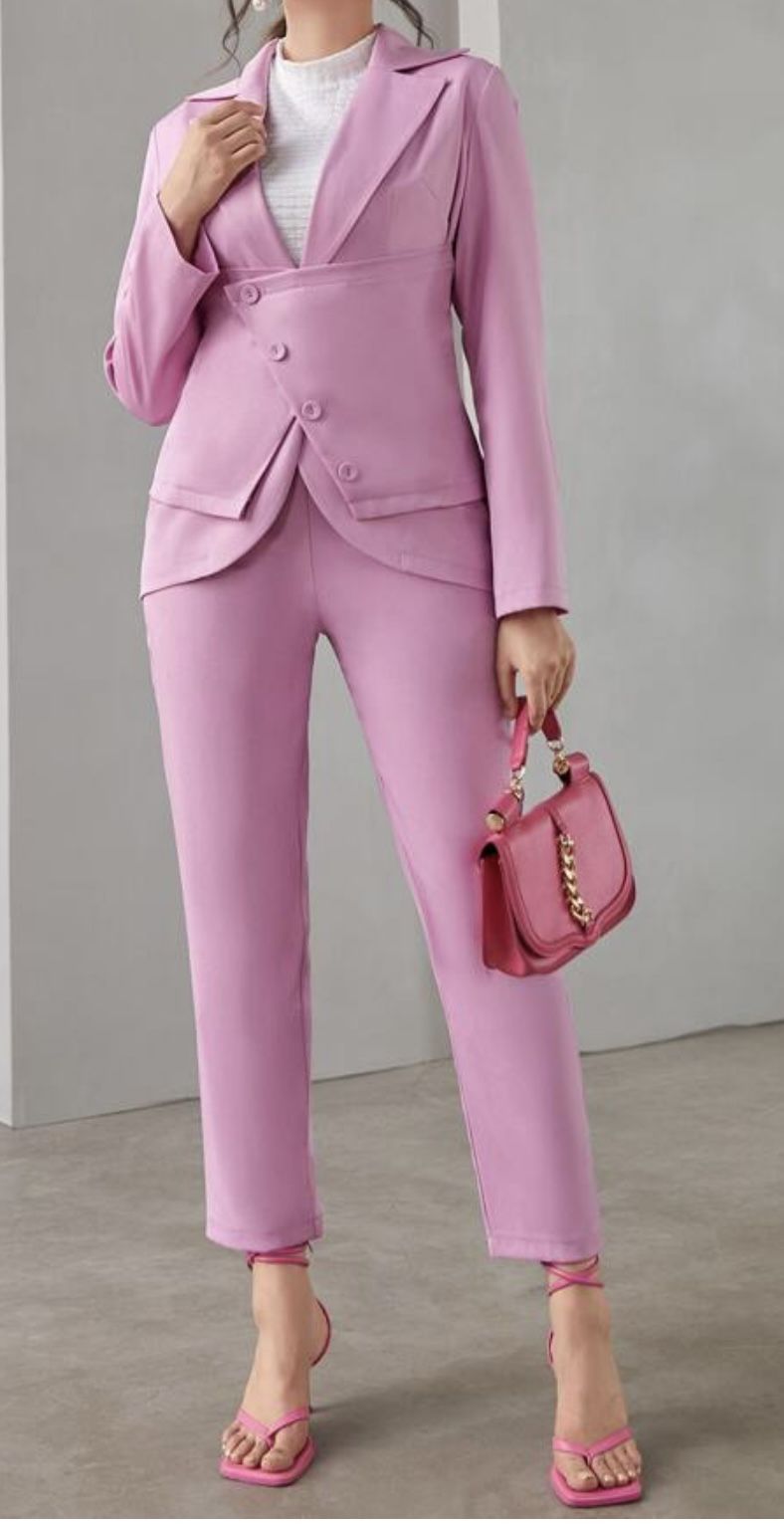 Step out in confidence with this chic light pink pantsuit, perfect for professional settings or stylish events. The tailored blazer features a flattering fit with a classic lapel and smooth lines, paired with ankle-length trousers for a modern silhouette. A crisp white top completes the look, and matching heels and a pink handbag add a touch of elegance (accessories not included). • Size: Medium • Condition: Excellent • Price: $40 (cash only) • Pickup: Vancouver, WA