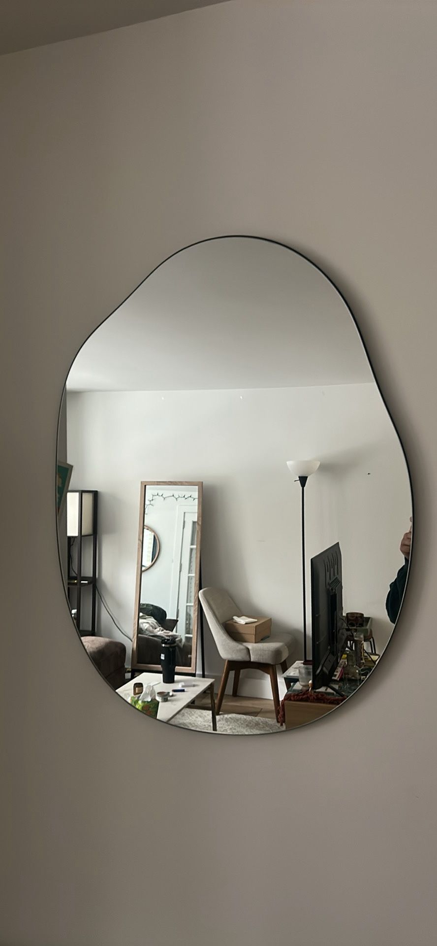 Condition: Excellent. No chips, cracks, or scratches on the glass. • Design: Minimalist thin black frame (or frameless polished edge) that blends seamlessly with any decor from Mid-Century Modern to Contemporary. • Orientation: Can be hung in multiple directions depending on your preference. • Size: approx 24” x 32”