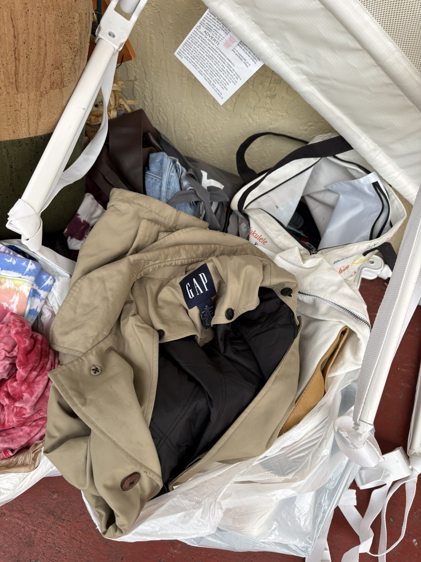 Different sizes of clothes , some kitchen items and a free table
