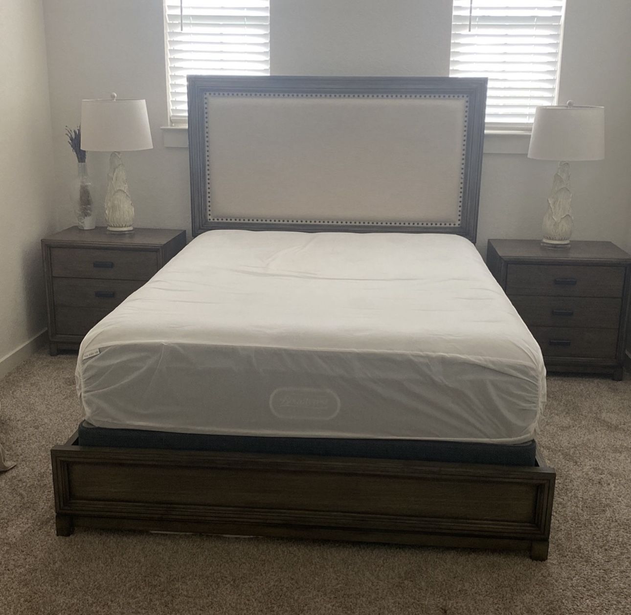 (Like New) Queen Bed-frame, Mattress, Headboard and two nightstands In perfect condition, still has some plastic Excellent wood quality.
