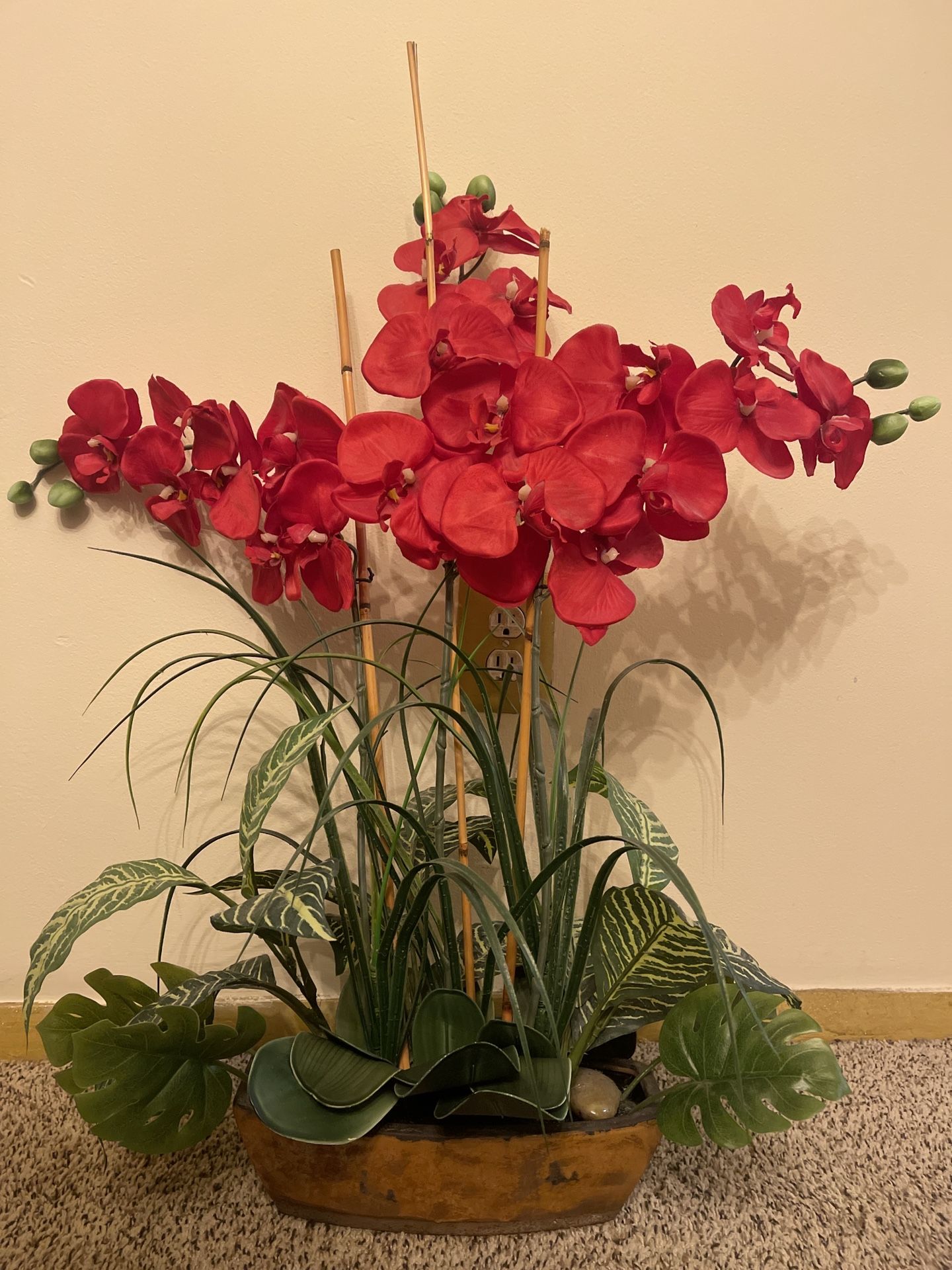 Beautiful artificial red orchid arrangement in a decorative pot. Very elegant and perfect for living rooms, offices, or entryways. No maintenance required. Excellent condition.