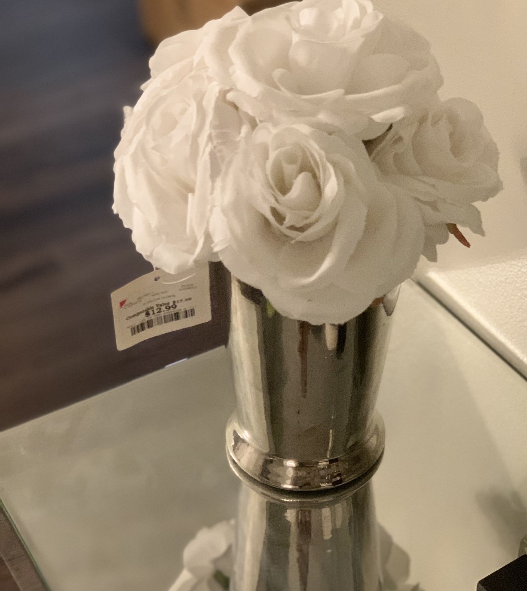 White flowers with silver chrome vase still new with price tag