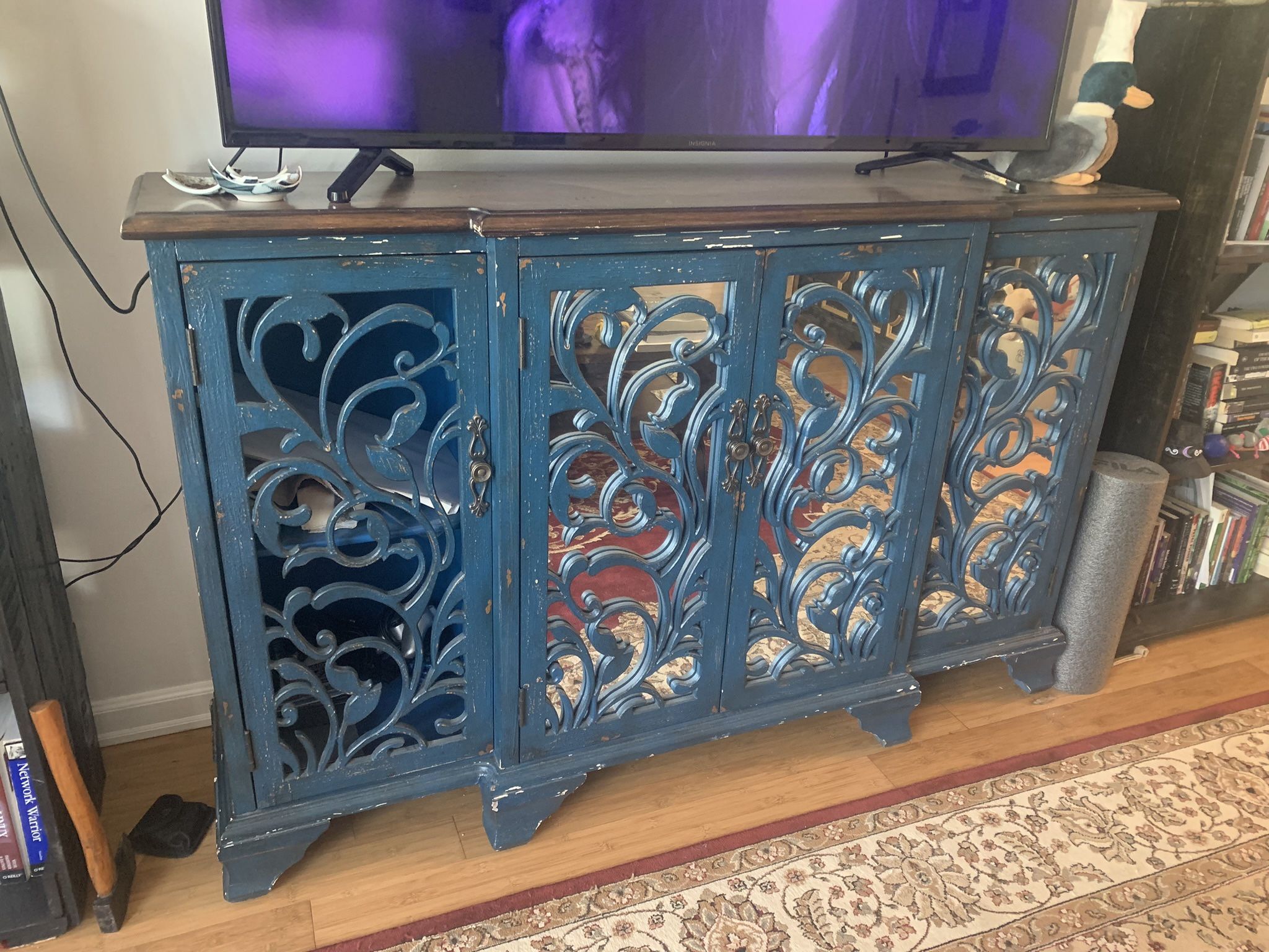 Made from old barn wood, missing mirror on left door, very sturdy. I use as a TV stand, but have used in dining room to put dishes, etc in. Very pretty.