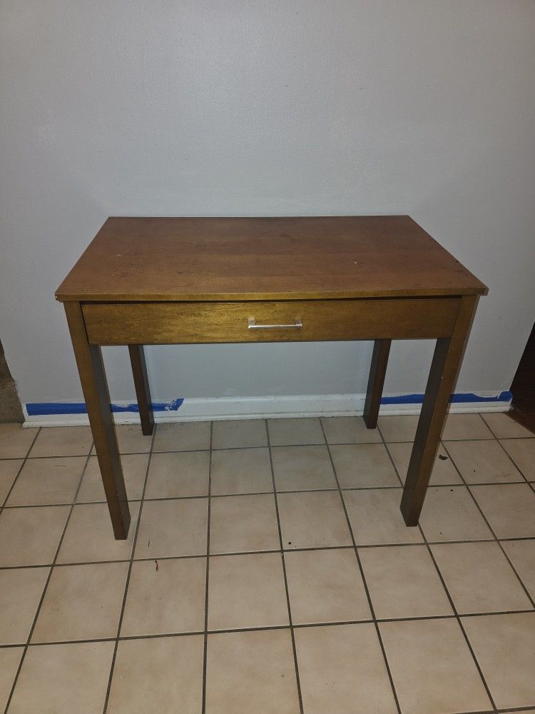 This item is a small wooden writing or computer desk with a single drawer, likely in a Mid-Century Modern or general modern minimalist style. Product Details Style: The desk features clean lines, a simple rectangular top, straight legs, and a single, horizontal metal pull, which are characteristic of Mid-Century Modern or minimalist design. Material and Finish: The finish appears to be a warm, acorn or natural wood tone, likely made from engineered wood with a wood