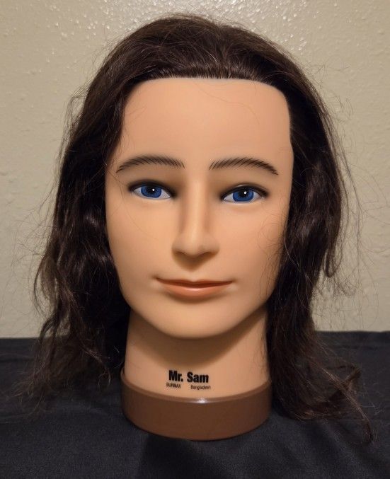 Professional-grade mannequin head for hairstyling, cutting, and cosmetology training. - Brand: Burmax - Model: Mr. Sam - Hair Type: Long brown synthetic hair - Features: Realistic facial features, blue eyes, neutral expression - Base: Sturdy brown base with printed branding Ideal for barbers, stylists, and students practicing fades, braids, or makeup techniques.