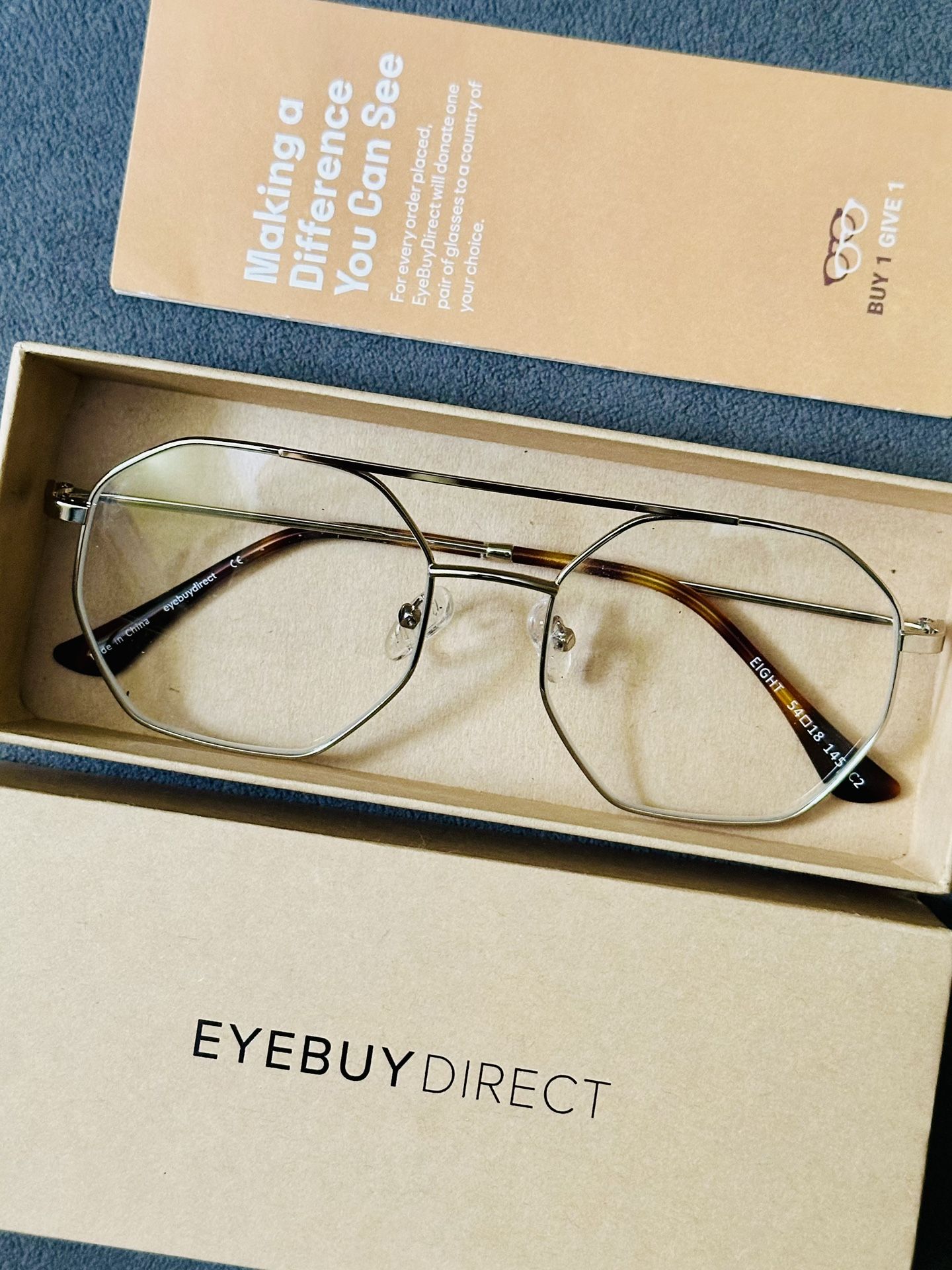 Brand-new square aviator glasses with a silver metal frame and tortoiseshell arms. Made by eyebuydirect. Lightweight design with a slim profile for a modern look. I have two pairs and never add prescription to this one. Never worn, in perfect condition.