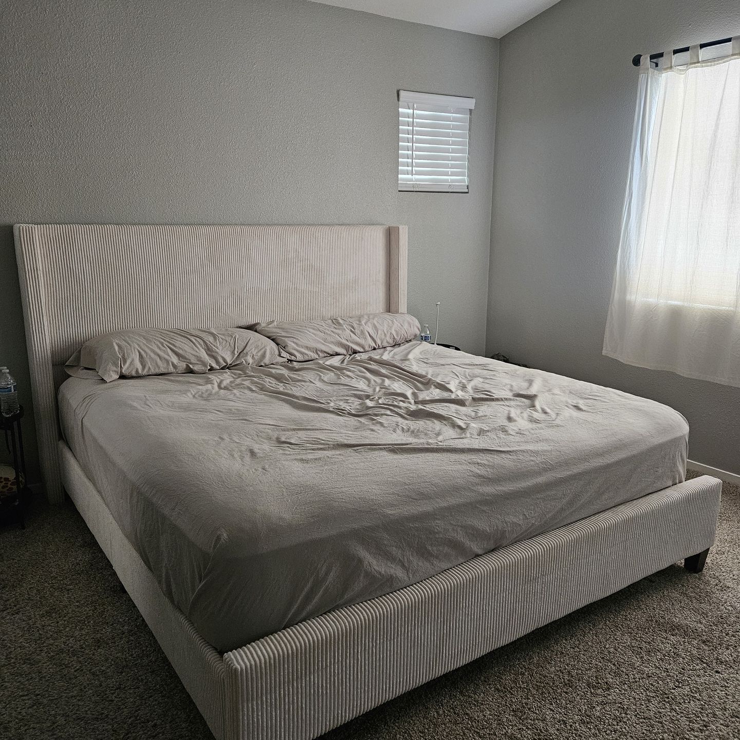 King size bed frame, brand new. *MATTRESS AND PILLOWS NOT INCLUDED*. Color is ivory and texture is corduroy. It's brand new out of the box, never used. I put it together and just doesn't fit my aesthetic, but too expensive to ship back to seller. Super sturdy & heavy with strong wooden slats. All parts are there, including extra bolts and packaging. It will be taken apart for ease of hauling.