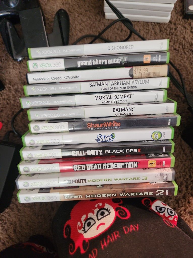 Fully functioning Xbox 360 with one controller, all cords, and games such as call of duty mw 2 and 3, black ops 2, Sean white snowboarding, mortal kombat komplete edition, batman arkham city, batman arkham asylum, red dead redemption, assassins creed, gta 5, dishonored, and the sims 3. Looking to sell for $120 OBO. Pick up in Maricopa.