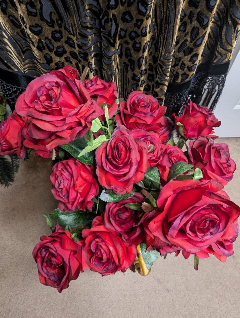 This is two dozen silk red roses I used for a project. These are red roses with a hue of blue. To give it a vintage to look more realistic Looked at my other posts. I have lots of flowers available