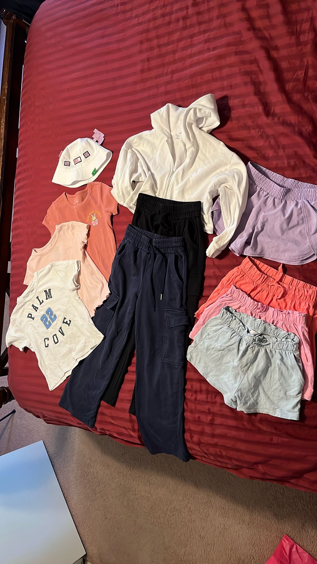 The clothing here is all marked 8 but I think they run a little small. Clothing fits span 6-8 Waist size 22” on all pants/shorts. White sweatshirt is crop style Black and Navy cotton Pants inseam 21” Hat first child head circumference ~ 18” Clean home, no smoking, not exposed to pets, excellent condition (cotton shorts could be ironed)