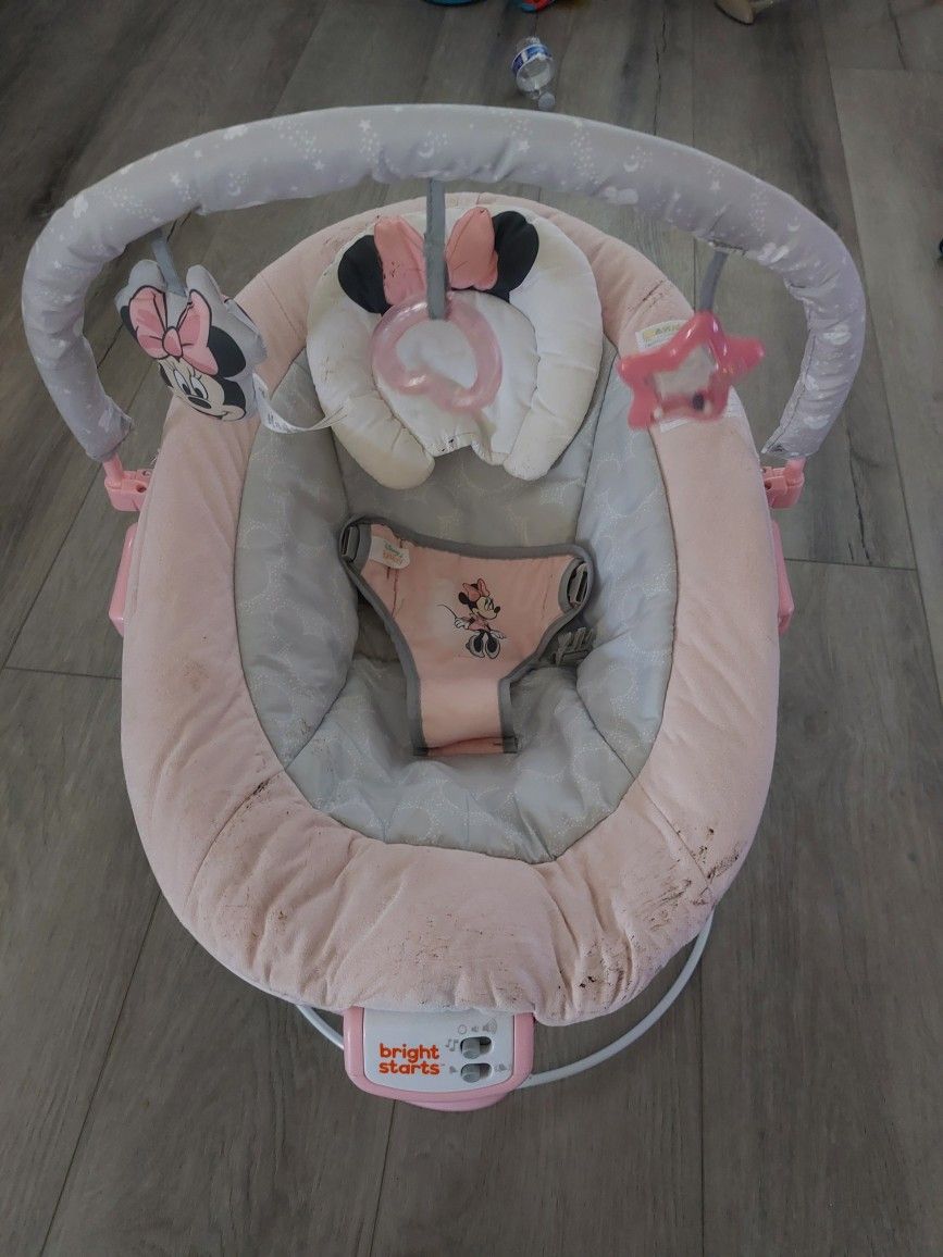 Minnie Mouse Vibrating Bouncer Seat plays music too. Has some damage to the fabric from my dryer overheating and burning some of it. Still functions as it should. $10obo Pick up in Hesperia 92345