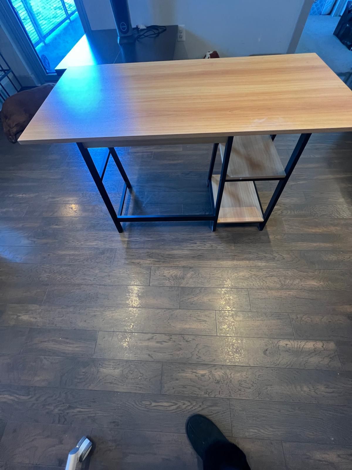 Modern desk with natural wood finish top and black metal frame. Includes lower shelving for extra storage or décor. Sturdy and great for home office or study setup. Clean modern aesthetic. Condition: Very good Pickup only