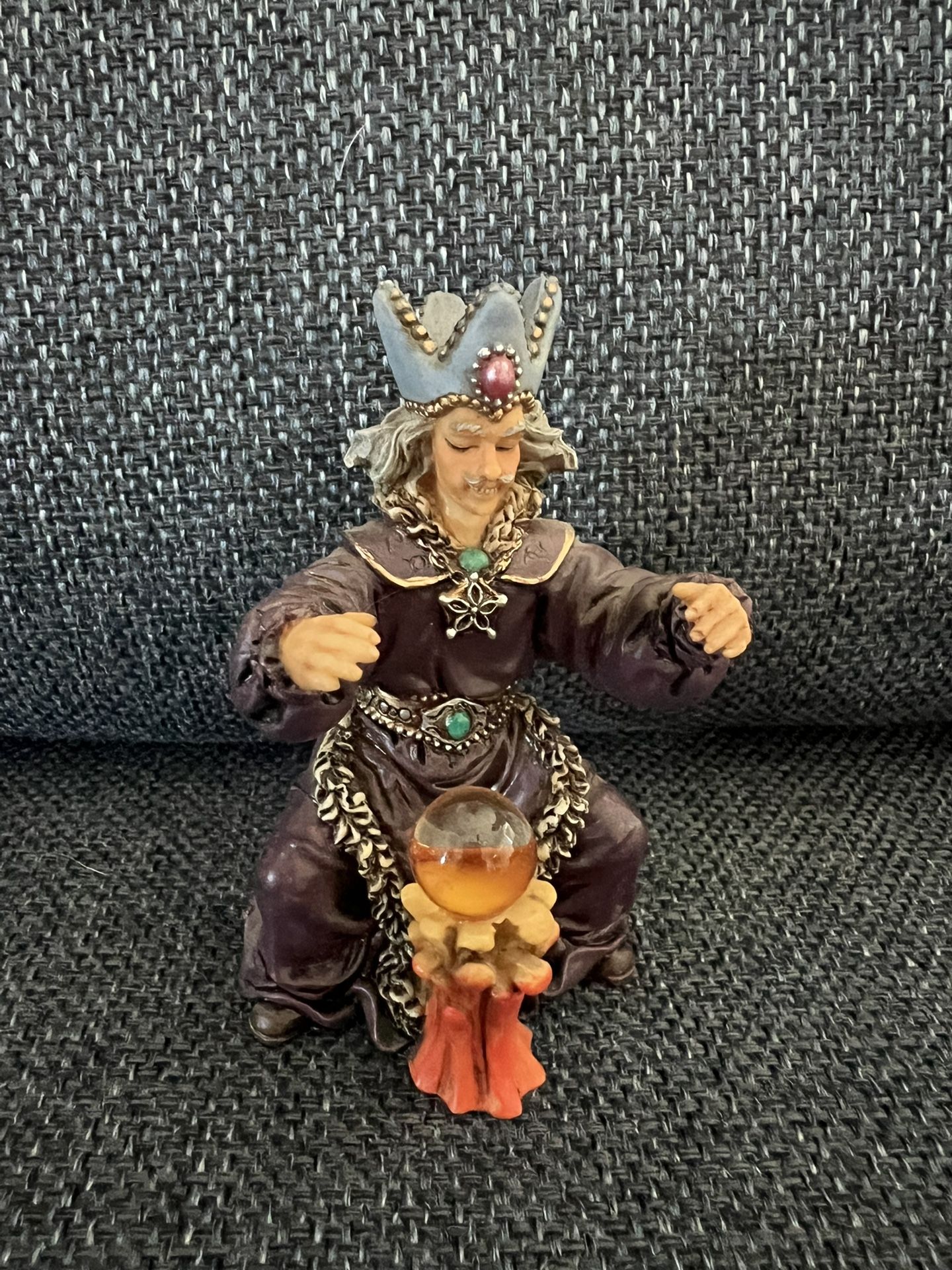 A purple robbed wizard statue that I have had for a while. I don’t know very much about it except for that It’s a pretty solid statue with a glass orb. The size 3 baby diaper is there for size comparison. $10 or best offer.