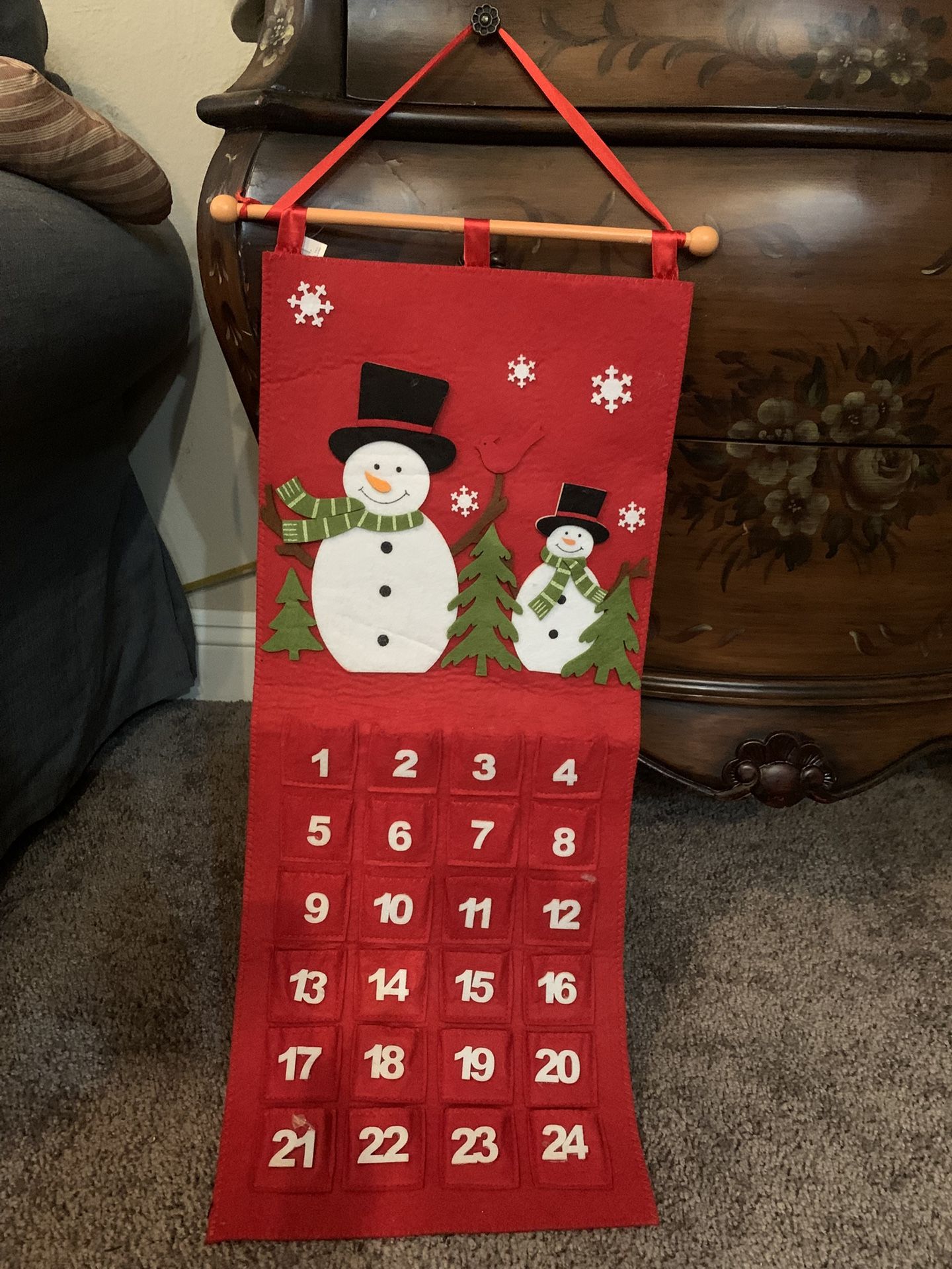 This handcrafted calendar has 24 numbered pockets to count down the days until Christmas.