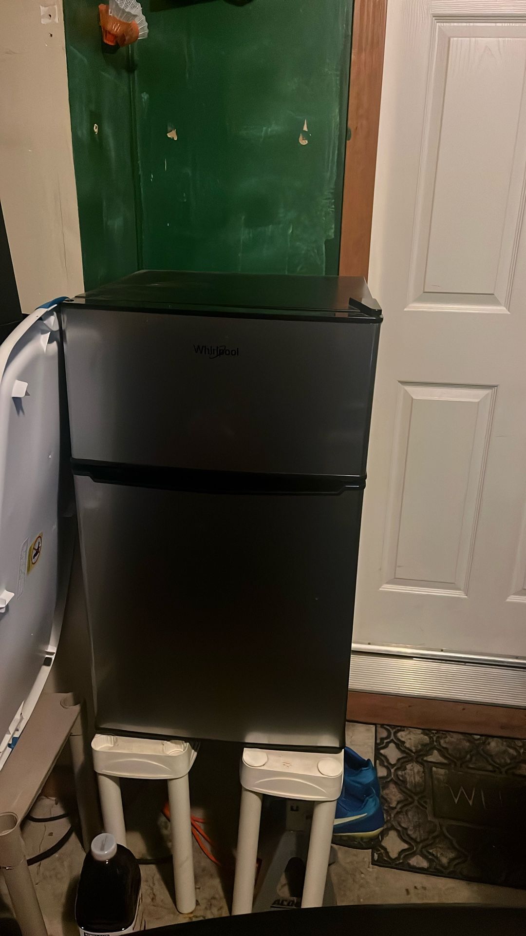 Garage mini fridge not needed anymore but still working as when we bought it, is missing one of the shelves but otherwise has everything