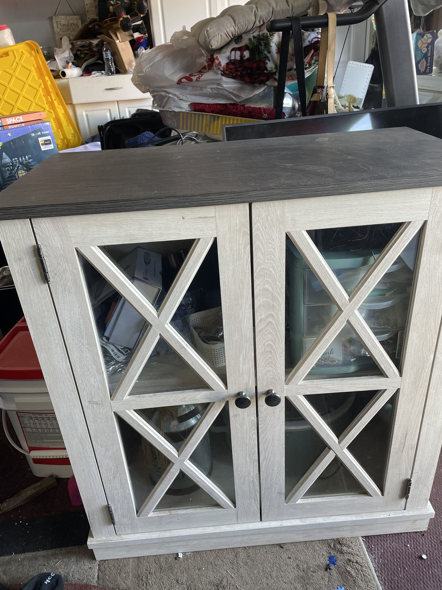 Small Dark gray and beige with glass doors, 2 shelves.