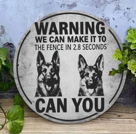 German Shepherd Dog Metal Wall Decor- Security Sign Plaque with "Warning We Can Make It to the Fence in 2.5 Seconds"- Black& White German Shepherd Decoration for Home, Office, Garage- 8x8in Ideal Gift for Dog Lovers 2D