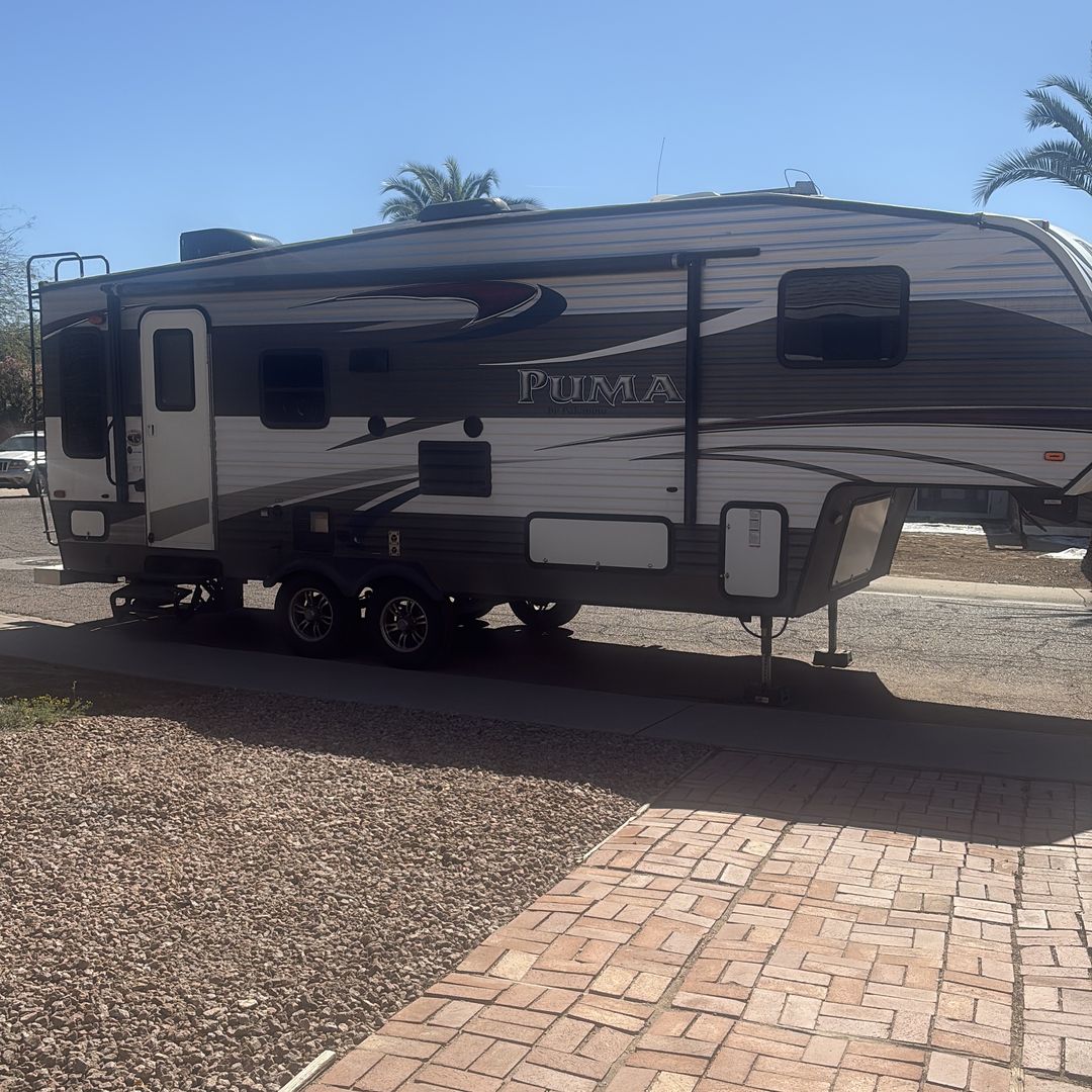 SALE PENDING Price reduced from 15K to 13K. OBO. Great smaller fifth wheel for 2 to 4 people! Length 28 feet, one slide out, cherry cabinets, large hallway closet is a great fixture and provides lots of storage space, 40 inch TV, custom-made metal bumper with storage and strong enough for a generator, 26 inch electric fireplace, oven, microwave, three burner stove, U- shaped dinette with cherry wood table, Fits queen bed (mattress not included), two – solar panels 300 watts, lithium battery. Comes with standard fifth wheel hitch. Weight ~ 9200 lbs so tows great. It is definitely worth a look! Location is near 32nd St. and Shea in Phoenix.