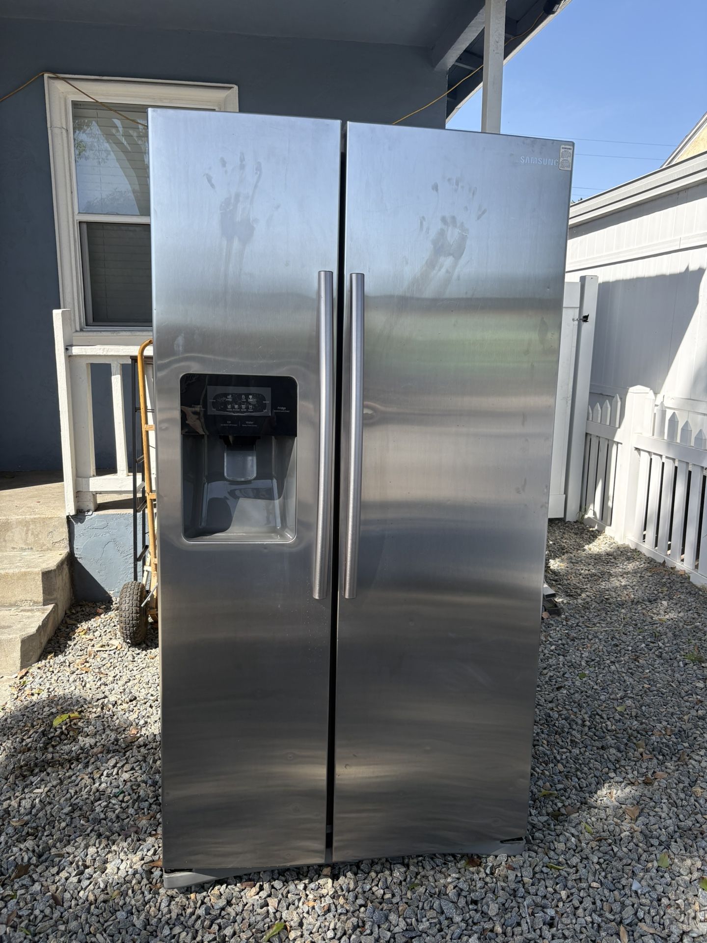 The refrigerator is in good working condition; only the bins are broken. The ice maker and water dispenser are both functioning properly.