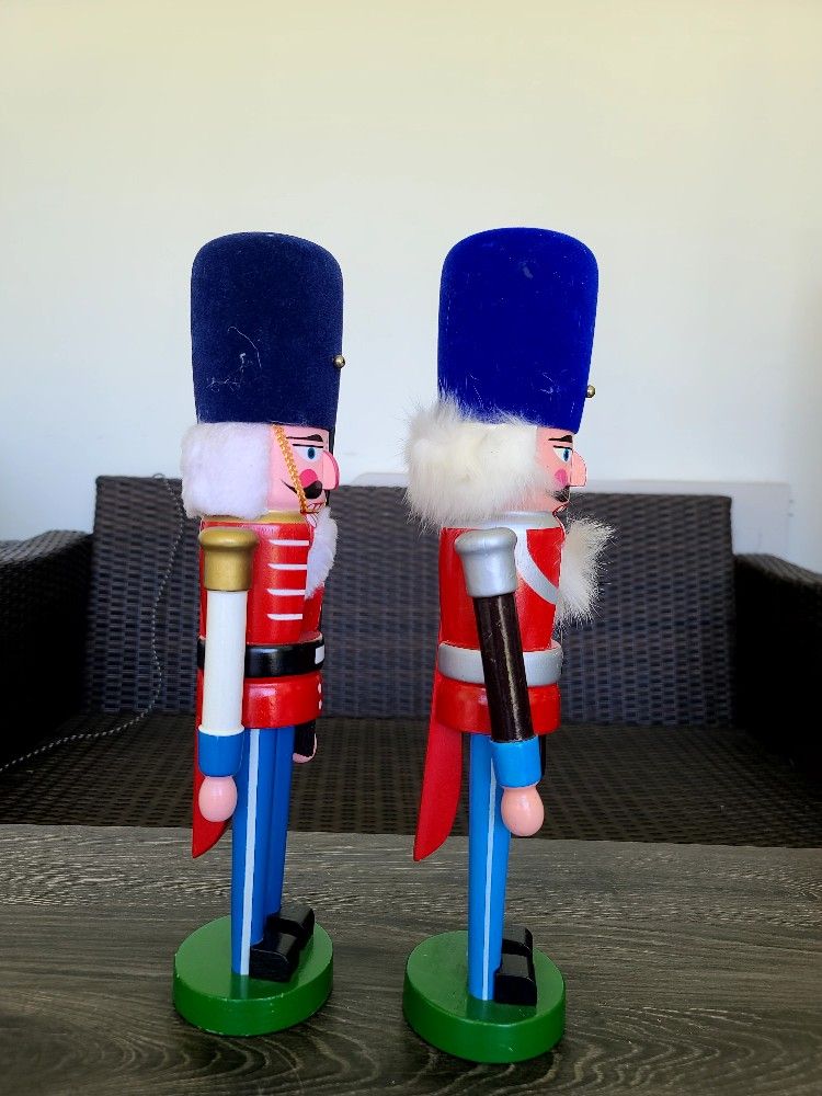 Vintage Christmas Nutcracker Soldier w/ Blue Velvet Helmet White Fur 13.5" Tall. Set Of 2