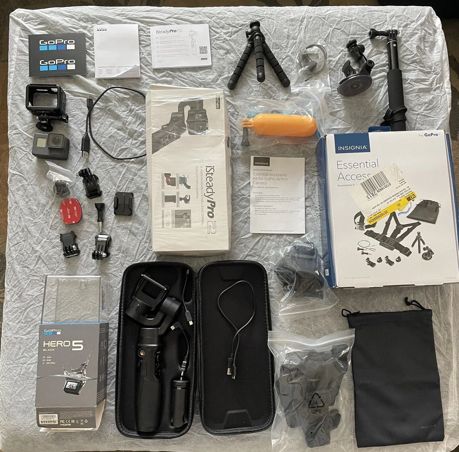 GoPro Hero 5 Black Bundle: -Complete Retail Box, -Insignia Accessory Kit, -iSteady Pro 2 Gimbal & More Unlock the full potential of action videography with this comprehensive GoPro Hero 5 Black package, tailored for enthusiasts and professionals alike. **GoPro Hero 5 Black - Gently Used:**- Condition: -Excellent working condition with minimal signs of use. only a crease in the corner from the case , see images- -Packaging: Original retail box, including all manuals.- Accessories: All included mounts and a protective case for the camera.- -Note: Micro SD card is not included. **Insignia Accessory Kit:**- Enhance your filming experience with a versatile tripod, a buoyant water stick for aquatic adventures, a convenient selfie stick for those personal shots, and a variety of mounts to secure your GoPro in any scenario.**iSteady Pro 2 Gimbal:**- Capture smooth and stable footage with the iSteady Pro 2 gimbal, complete with all attachments, instructions, and cords for immediate use.This bundle is perfect for adventurers, vloggers, and everyone in between. Dive into professional-grade filming with this all-in-one kit that meets all your action-capturing needs.
