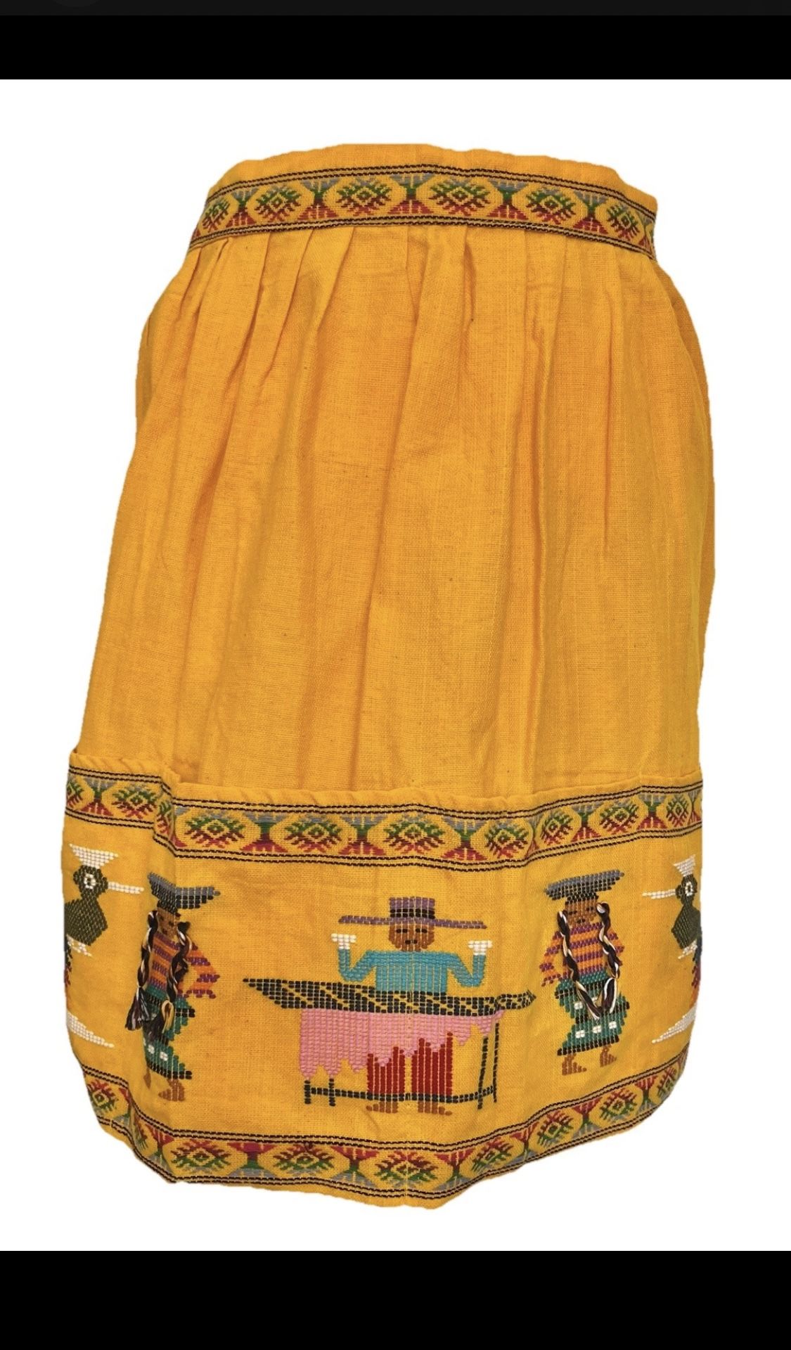 This handmade apron from the Maya lands of Guatemala, features a vibrant yellow color with a unique design, the marimba, quetzal, men with belts and woman with braids. The craftsmanship and traditional elements make it a standout piece for anyone looking to add a piece of Latin American culture to their wardrobe. For daily use or special occasions. Length 20.5”. /52 cm Hem 29” Straps 28” each Across top including straps 73” Pockets 8” deep