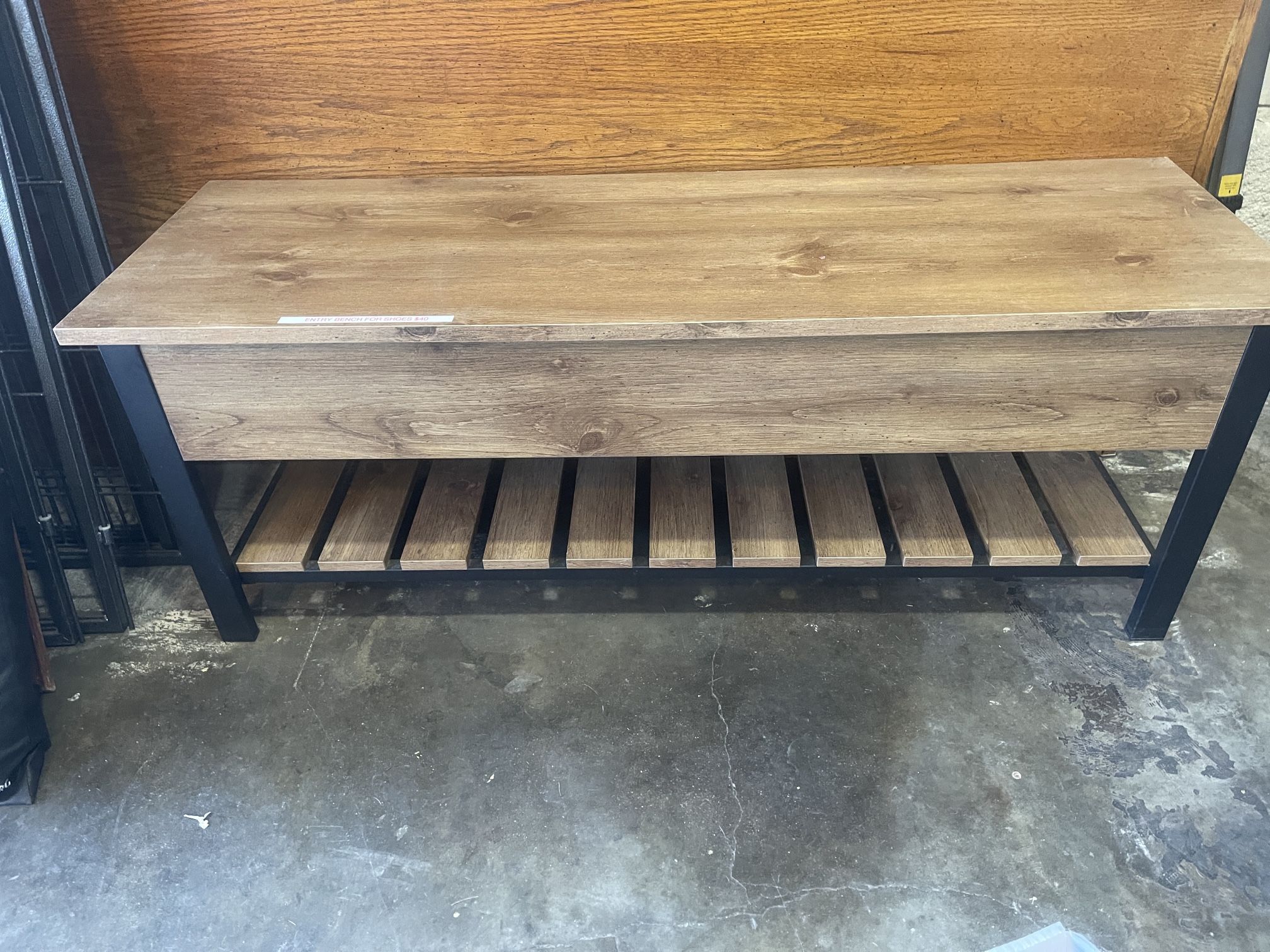 Beautiful and functional entry bench. Store shoes on lower shelf. Bench lid lifts up for more storage. 48” long