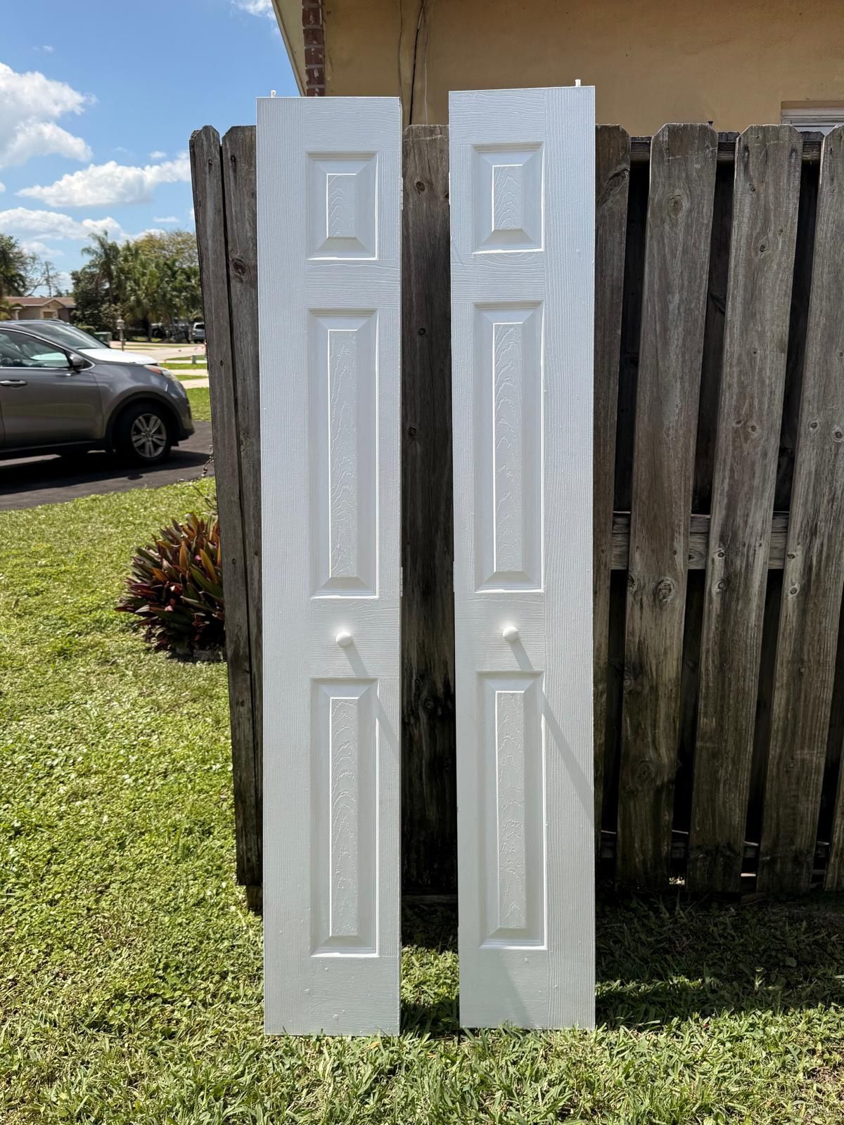 Valued, new: $104. Asking $35 each. Used In good condition. 6 Panel Colonial Textured Molded Composite Closet Bi-Fold Door, MDF Wood, White with plain backing on door, non-textured.