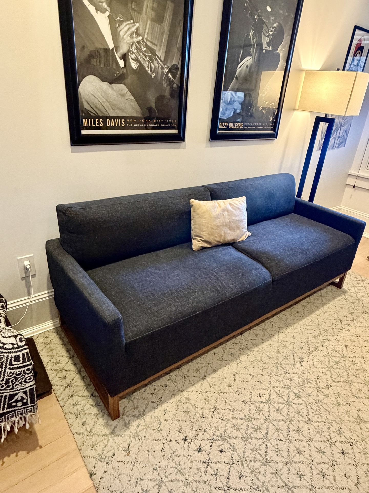 Excellent/like new sleeper sofa in Navy with walnut base. Sofa is smaller scale and perfect for an office or bonus room where you host guests but don’t want a guest bed in the way. Unlike most sleeper sofas that have a mattress that is smaller than a queen, this flips open to a proper queen dimension of 60”x80”. Firm futon-like comfort- no hard bars on this style of sleeper which is nice. We do add a mattress topper to this for a little extra softness which is in great shape and can be included at no extra charge. Low to the ground so it’s not ideal if you’re hosting guests with limited mobility. Hosted guests approximately 10 nights total over the last 3 years- in excellent shape with no visible wear anywhere. Smoke free home, no pets, no kids. The Blu Dot showroom is close by on Capitol Hill should you want to scope this model out and get a demo before coming to see ours. On third floor, two to three strong adults recommended to stair carry to your own truck, pickup location is near Volunteer Park. -Solid hardwood and wood frame -Plain-sliced walnut veneer on solid hardwood base -High resiliency tight upholstery-wrapped foam seat and back cushion -Tofte Navy: 85% Polyester / 15% Linen | 100,000+ Double Rubs