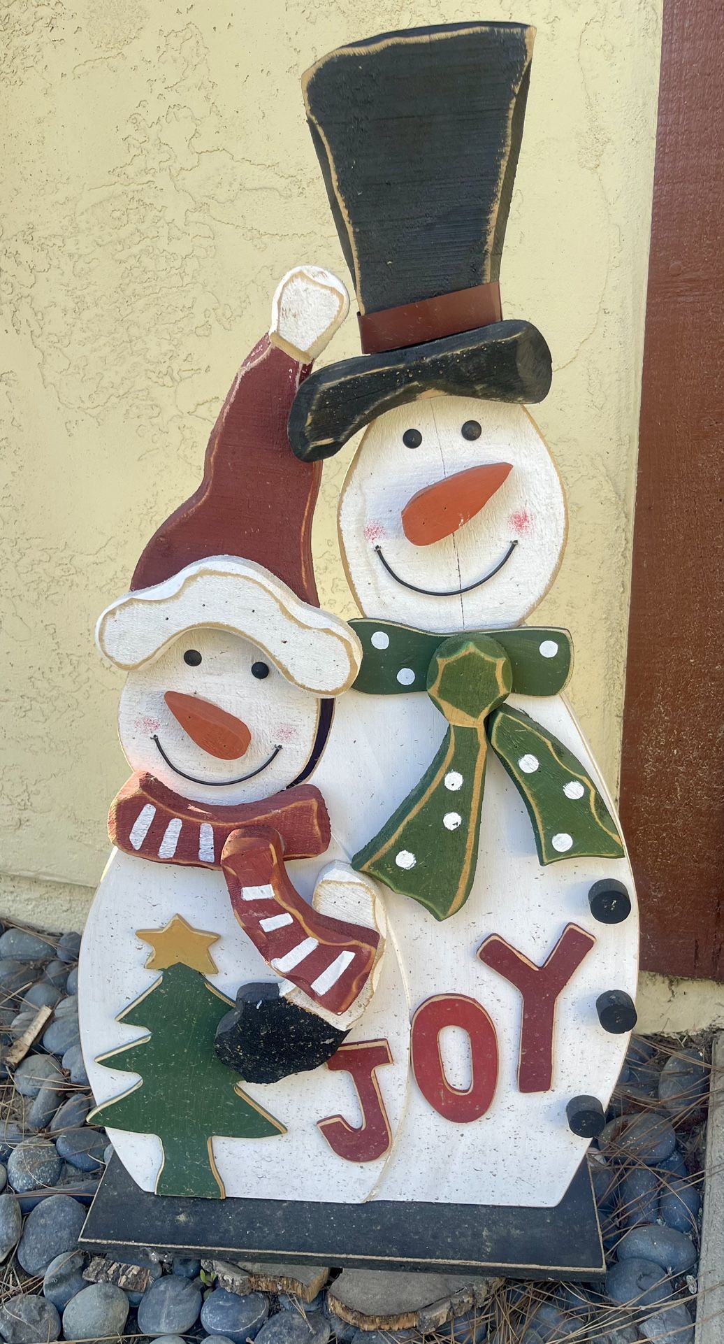 Wooden outdoor Christmas Decoration Bring holiday cheer to your home with this charming wooden Christmas decoration! Featuring two adorable snowmen with festive hats and scarves, this piece spells out “JOY” and includes a cute Christmas tree detail. • Condition: Used, but in EXCELENT condition. • Price: $20 • Pickup: Local pickup only. Perfect for your porch, entryway, or as part of your indoor decorations. Message me if you’re interested! FIRM PRICE 🏷️
