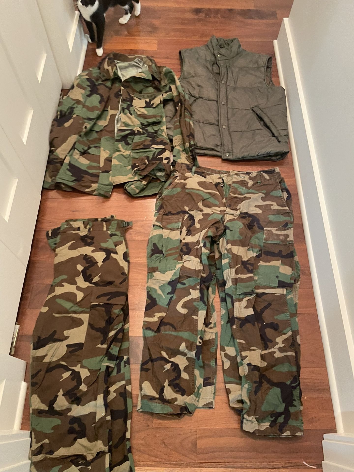Three pairs of size medium pants, one slightly larger sized pants, two button up shirts, one button up vest. Preferably want to sell the whole lot at once. Take btc, cash, venmo