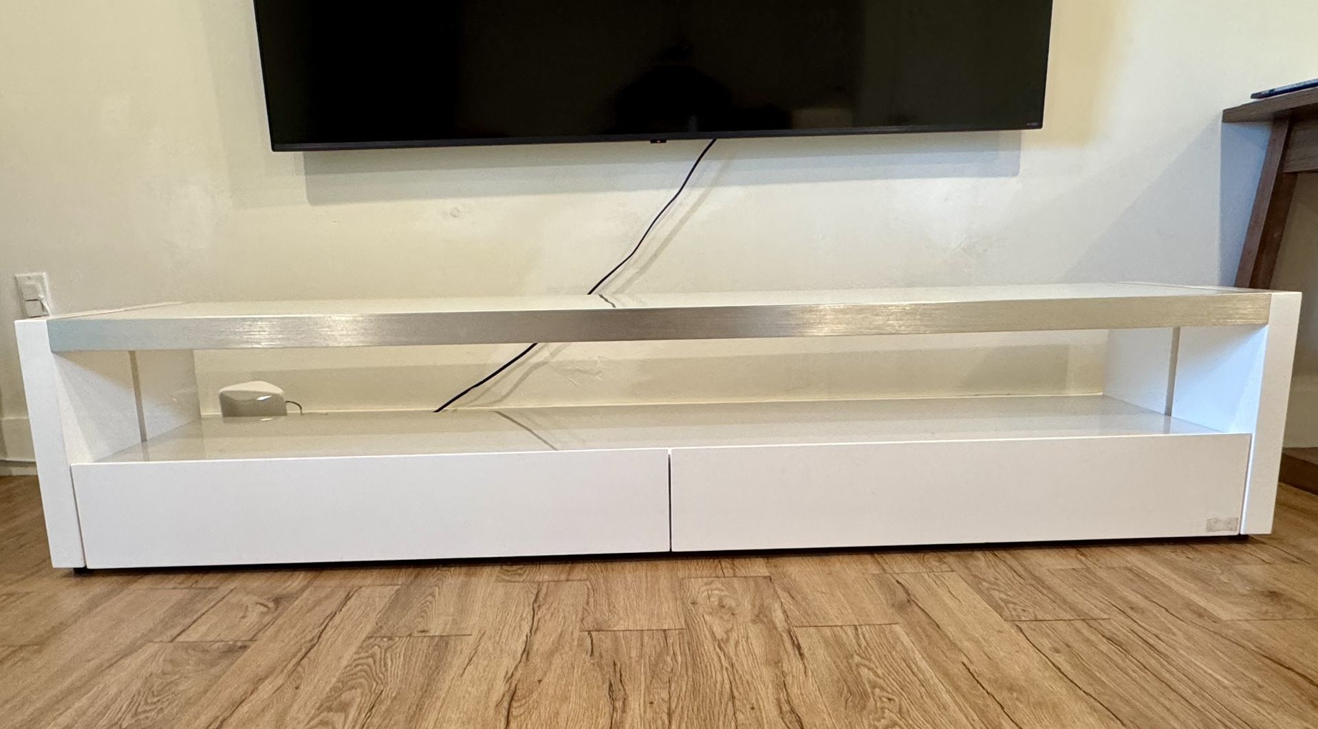 Modern White TV Stand - from El Dorado furniture Carlo Perazzi Furniture Collection Material: wood and tempered glass (It’s heavy, amazing quality) 2 large drawers. Like new.