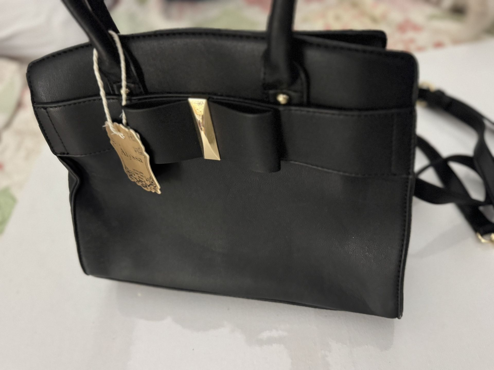 I have a beautiful purse. It is New by ALYSSA Ashley it is a vegan purse it is black in color it’s vegan no nicks scratches or smells. It’s a vegan purse.